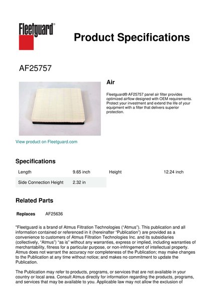 Fleetguard® AF25757 panel air filter provides optimized airflow designed with OEM requirements. Protect your investment and extend the life of your equipment with a filter that delivers superior protection.Specification