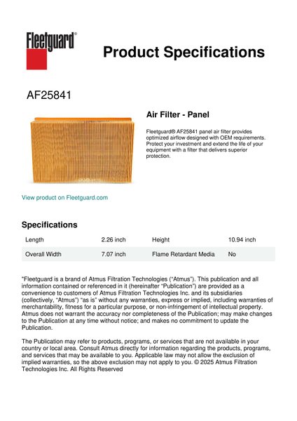 Fleetguard® AF25841 panel air filter provides optimized airflow designed with OEM requirements. Protect your investment and extend the life of your equipment with a filter that delivers superior protection.Specification