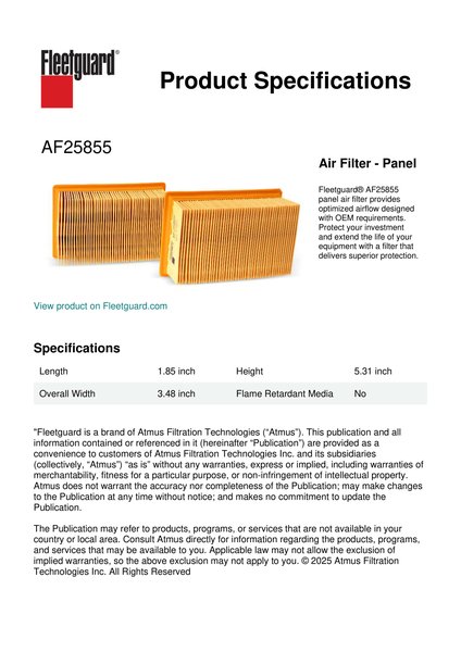 Fleetguard® AF25855 panel air filter provides optimized airflow designed with OEM requirements. Protect your investment and extend the life of your equipment with a filter that delivers superior protection.Specification