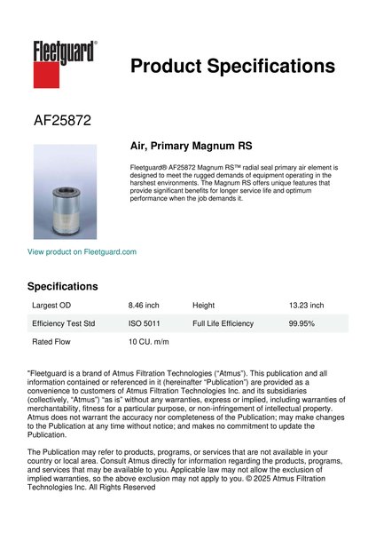 Fleetguard® AF25872 Magnum RS™ radial seal primary air element is designed to meet the rugged demands of equipment operating in the harshest environments. The Magnum RS offers unique features that provide significant benefits for longer service life and optimum performance when the job demands it.
