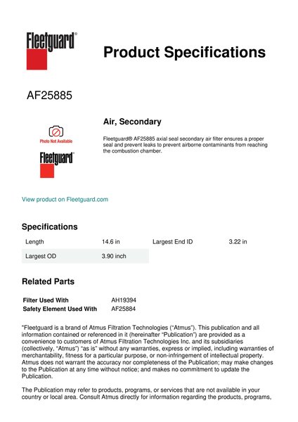 Fleetguard® AF25885 axial seal secondary air filter ensures a proper seal and prevent leaks to prevent airborne contaminants from reaching the combustion chamber.Specification
