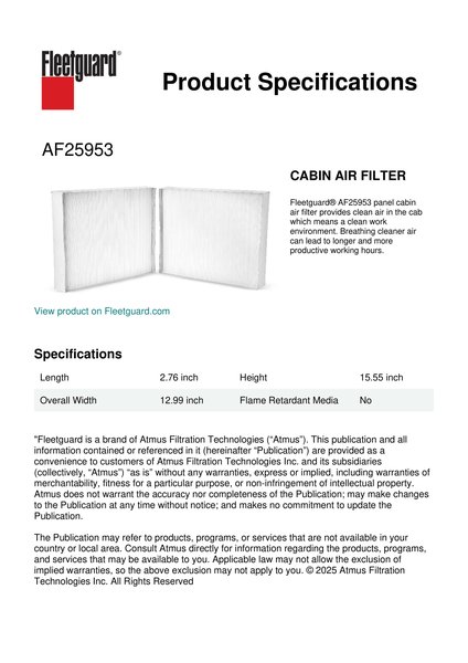 Fleetguard® AF25953 panel cabin air filter provides clean air in the cab which means a clean work environment. Breathing cleaner air can lead to longer and more productive working hours.Specification