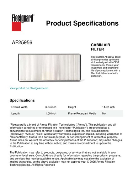 Fleetguard® AF25956 panel air filter provides optimized airflow designed with OEM requirements. Protect your investment and extend the life of your equipment with a filter that delivers superior protection.Specification