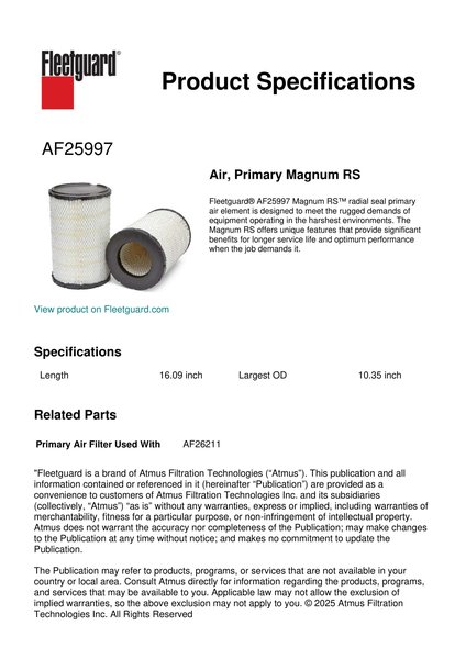 Fleetguard® AF25997 Magnum RS™ radial seal primary air element is designed to meet the rugged demands of equipment operating in the harshest environments. The Magnum RS offers unique features that provide significant benefits for longer service life and optimum performance when the job demands it.Specification