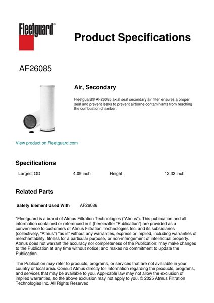 Fleetguard AF26085 Air, Secondary