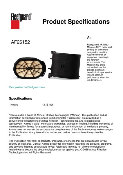Fleetguard® AF26152 Magnum RS™ radial seal primary air element is designed to meet the rugged demands of equipment operating in the harshest environments. The Magnum RS offers unique features that provide significant benefits for longer service life and optimum performance when the job demands it.Specification