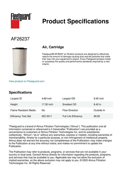 Fleetguard® AF26237 air filtration products are designed to effectively reduce the amount of damage-causing dust and dirt particles that make their way into your equipment’s engine. Every Fleetguard product meets or surpasses the quality and performance standards required by a new engine.Specification
