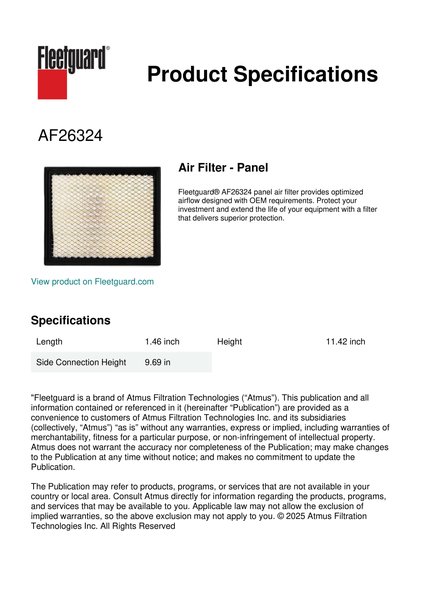 Fleetguard® AF26324 panel air filter provides optimized airflow designed with OEM requirements. Protect your investment and extend the life of your equipment with a filter that delivers superior protection.Specification