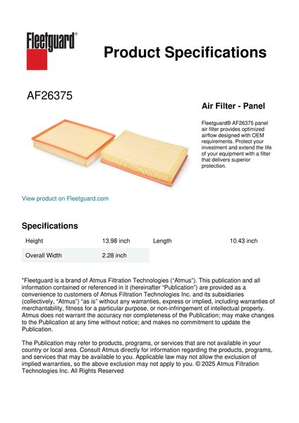 Fleetguard® AF26375 panel air filter provides optimized airflow designed with OEM requirements. Protect your investment and extend the life of your equipment with a filter that delivers superior protection.Specification