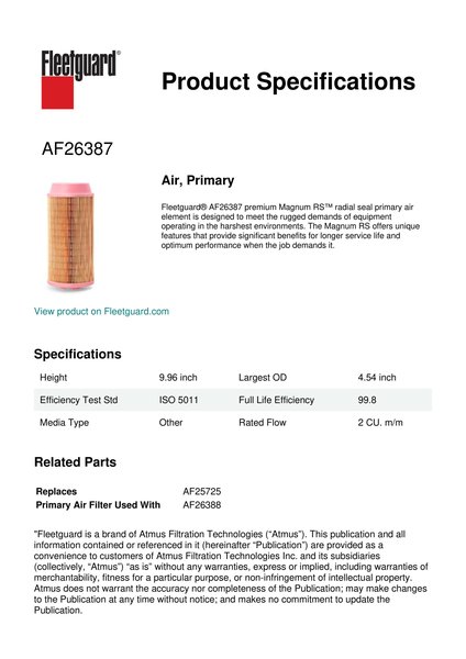 Fleetguard® AF26387 premium Magnum RS™ radial seal primary air element is designed to meet the rugged demands of equipment operating in the harshest environments. The Magnum RS offers unique features that provide significant benefits for longer service life and optimum performance when the job demands it.