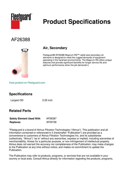 Fleetguard® AF26388 Magnum RS™ radial seal secondary air elements is designed to meet the rugged demands of equipment operating in the harshest environments. The Magnum RS offers unique features that provide significant benefits for longer service life and optimum performance when the job demands it.Specification