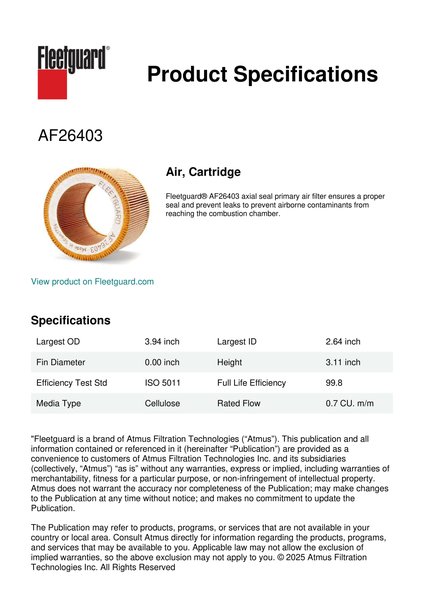 Fleetguard® AF26403 axial seal primary air filter ensures a proper seal and prevent leaks to prevent airborne contaminants from reaching the combustion chamber.