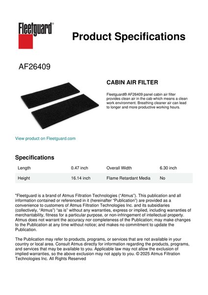 Fleetguard® AF26409 panel cabin air filter provides clean air in the cab which means a clean work environment. Breathing cleaner air can lead to longer and more productive working hours.Specification