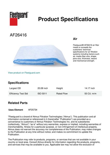 Fleetguard® AF26416 air filter meets or exceeds the customers’ technical specifications for air filtration systems including factors such as: media fiber size, shape, pore size, thickness, weave and mechanical strength.