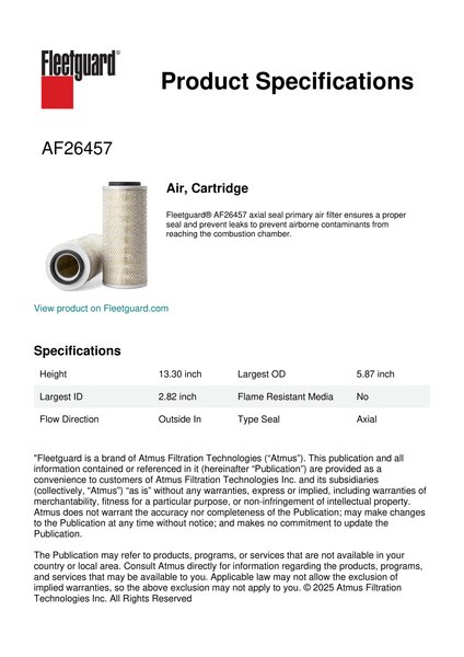 Fleetguard® AF26457 axial seal primary air filter ensures a proper seal and prevent leaks to prevent airborne contaminants from reaching the combustion chamber.