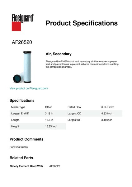 Fleetguard® AF26520 axial seal secondary air filter ensures a proper seal and prevent leaks to prevent airborne contaminants from reaching the combustion chamber.Specification