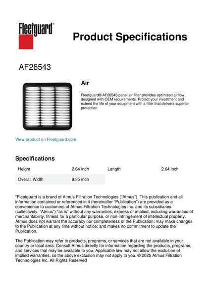 Fleetguard® AF26543 panel air filter provides optimized airflow designed with OEM requirements. Protect your investment and extend the life of your equipment with a filter that delivers superior protection.Specification