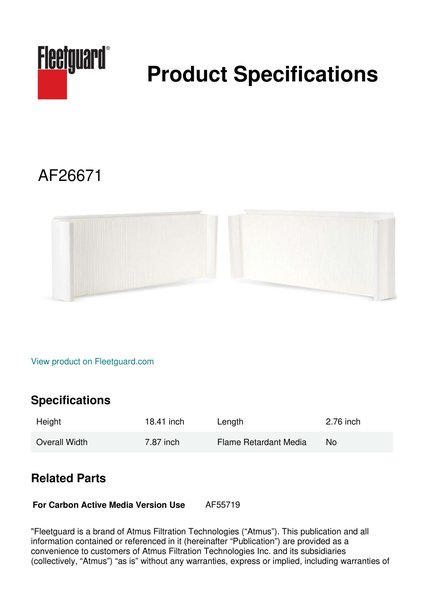 Fleetguard® AF26671 panel cabin air filter provides clean air in the cab which means a clean work environment. Breathing cleaner air can lead to longer and more productive working hours.Specification