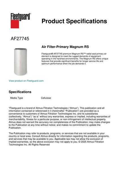 Fleetguard® AF27745 premium Magnum RS™ radial seal primary air element is designed to meet the rugged demands of equipment operating in the harshest environments. The Magnum RS offers unique features that provide significant benefits for longer service life and optimum performance when the job demands it.