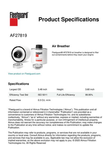 Fleetguard® AF27819 air breather is designed to filter out contaminants before they reach your engine.Specification