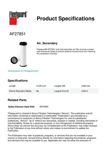 Fleetguard® AF27851 axial seal secondary air filter ensures a proper seal and prevent leaks to prevent airborne contaminants from reaching the combustion chamber.
