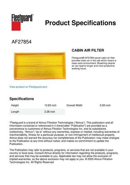 Fleetguard® AF27854 panel cabin air filter provides clean air in the cab which means a clean work environment. Breathing cleaner air can lead to longer and more productive working hours.Specification
