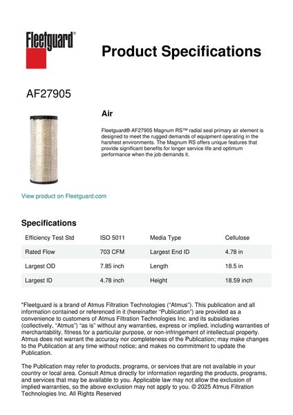 Fleetguard® AF27905 Magnum RS™ radial seal primary air element is designed to meet the rugged demands of equipment operating in the harshest environments. The Magnum RS offers unique features that provide significant benefits for longer service life and optimum performance when the job demands it.Specification