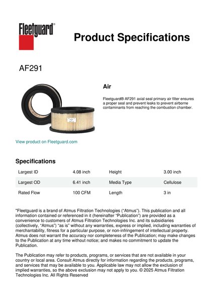 Fleetguard® AF291 axial seal primary air filter ensures a proper seal and prevent leaks to prevent airborne contaminants from reaching the combustion chamber.