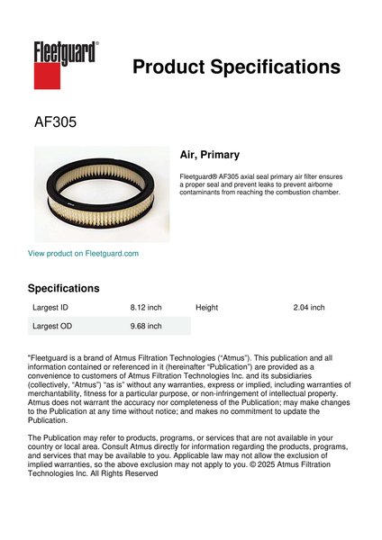 Fleetguard® AF305 axial seal primary air filter ensures a proper seal and prevent leaks to prevent airborne contaminants from reaching the combustion chamber.Specification