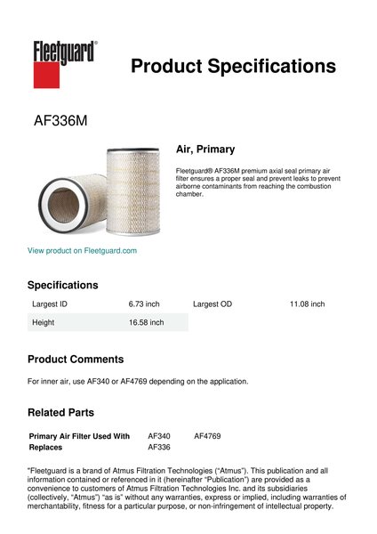 Fleetguard® AF336M premium axial seal primary air filter ensures a proper seal and prevent leaks to prevent airborne contaminants from reaching the combustion chamber.