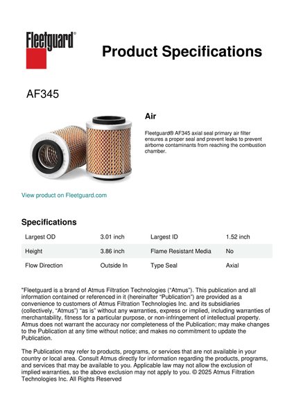 Fleetguard® AF345 axial seal primary air filter ensures a proper seal and prevent leaks to prevent airborne contaminants from reaching the combustion chamber.