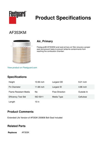 Fleetguard® AF353KM axial seal primary air filter ensures a proper seal and prevent leaks to prevent airborne contaminants from reaching the combustion chamber.