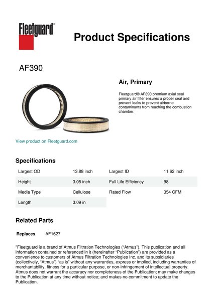 Fleetguard® AF390 premium axial seal primary air filter ensures a proper seal and prevent leaks to prevent airborne contaminants from reaching the combustion chamber.Specification