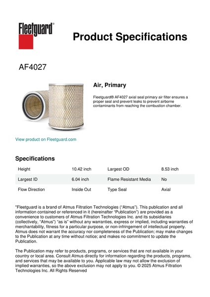 Fleetguard® AF4027 axial seal primary air filter ensures a proper seal and prevent leaks to prevent airborne contaminants from reaching the combustion chamber.