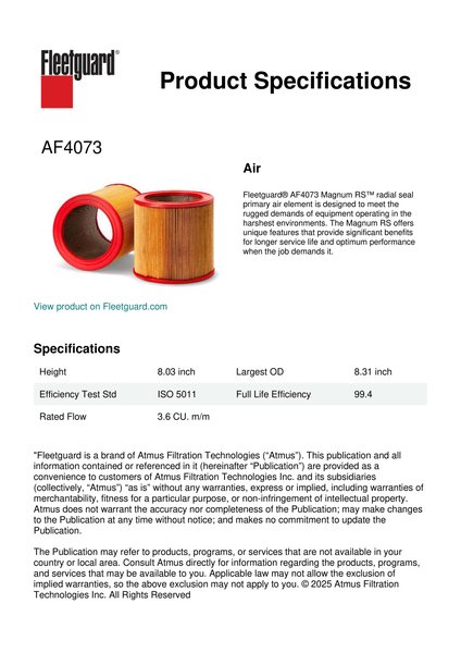 Fleetguard® AF4073 Magnum RS™ radial seal primary air element is designed to meet the rugged demands of equipment operating in the harshest environments. The Magnum RS offers unique features that provide significant benefits for longer service life and optimum performance when the job demands it.
