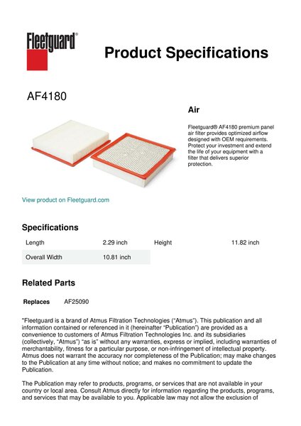 Fleetguard® AF4180 premium panel air filter provides optimized airflow designed with OEM requirements. Protect your investment and extend the life of your equipment with a filter that delivers superior protection.Specification