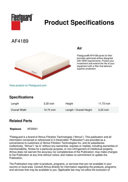 Fleetguard® AF4189 panel air filter provides optimized airflow designed with OEM requirements. Protect your investment and extend the life of your equipment with a filter that delivers superior protection.Specification