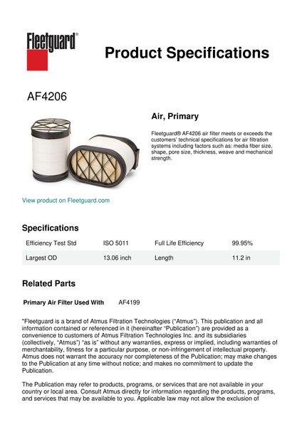 Fleetguard® AF4206 air filter meets or exceeds the customers’ technical specifications for air filtration systems including factors such as: media fiber size, shape, pore size, thickness, weave and mechanical strength.Specification
