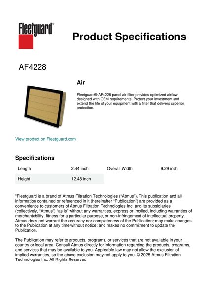 Fleetguard® AF4228 panel air filter provides optimized airflow designed with OEM requirements. Protect your investment and extend the life of your equipment with a filter that delivers superior protection.Specification