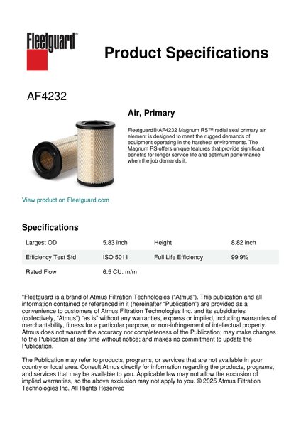 Fleetguard® AF4232 Magnum RS™ radial seal primary air element is designed to meet the rugged demands of equipment operating in the harshest environments. The Magnum RS offers unique features that provide significant benefits for longer service life and optimum performance when the job demands it.Specification