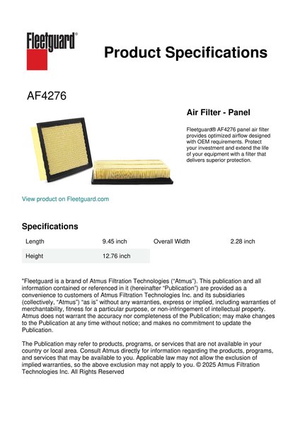 Fleetguard® AF4276 panel air filter provides optimized airflow designed with OEM requirements. Protect your investment and extend the life of your equipment with a filter that delivers superior protection.Specification