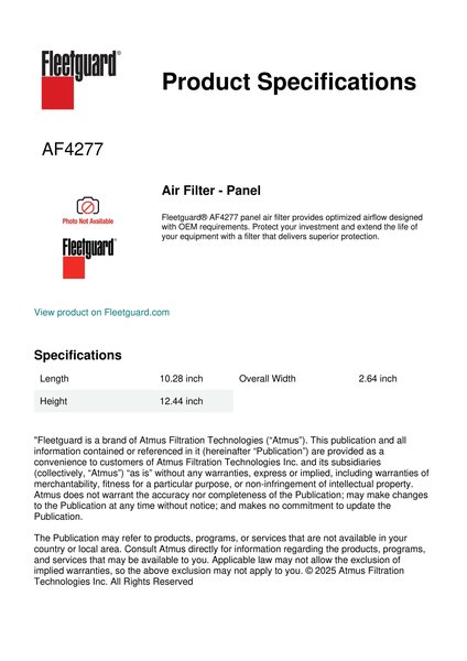 Fleetguard® AF4277 panel air filter provides optimized airflow designed with OEM requirements. Protect your investment and extend the life of your equipment with a filter that delivers superior protection.Specification