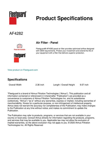 Fleetguard® AF4282 panel air filter provides optimized airflow designed with OEM requirements. Protect your investment and extend the life of your equipment with a filter that delivers superior protection.Specification
