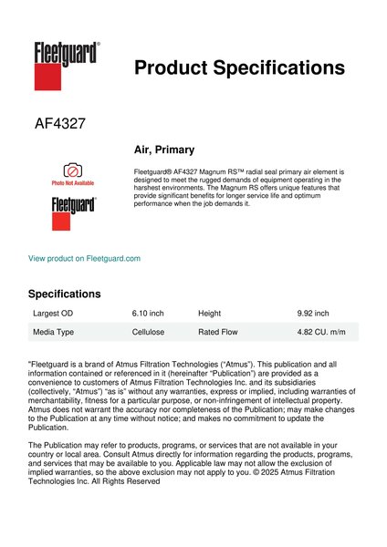 Fleetguard® AF4327 Magnum RS™ radial seal primary air element is designed to meet the rugged demands of equipment operating in the harshest environments. The Magnum RS offers unique features that provide significant benefits for longer service life and optimum performance when the job demands it.