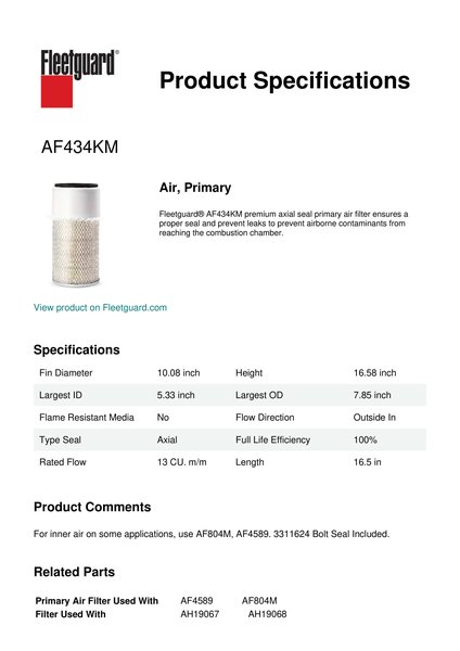 Fleetguard® AF434KM premium axial seal primary air filter ensures a proper seal and prevent leaks to prevent airborne contaminants from reaching the combustion chamber.