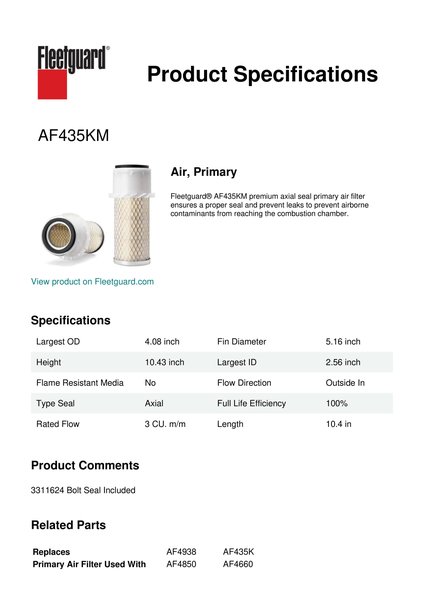 Fleetguard® AF435KM premium axial seal primary air filter ensures a proper seal and prevent leaks to prevent airborne contaminants from reaching the combustion chamber.