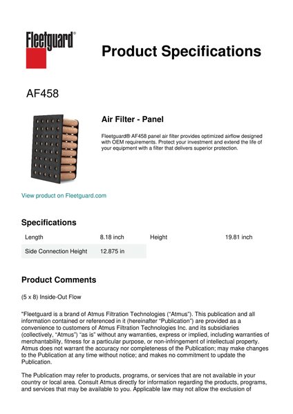 Fleetguard® AF458 panel air filter provides optimized airflow designed with OEM requirements. Protect your investment and extend the life of your equipment with a filter that delivers superior protection.Specification
