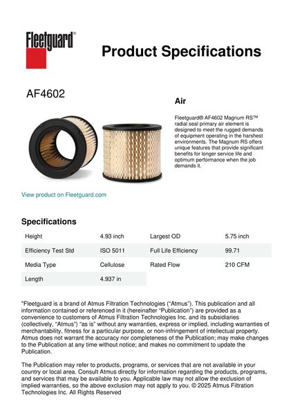 Fleetguard® AF4602 Magnum RS™ radial seal primary air element is designed to meet the rugged demands of equipment operating in the harshest environments. The Magnum RS offers unique features that provide significant benefits for longer service life and optimum performance when the job demands it.Specification