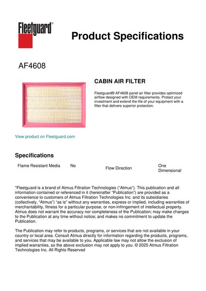 Fleetguard® AF4608 panel air filter provides optimized airflow designed with OEM requirements. Protect your investment and extend the life of your equipment with a filter that delivers superior protection.Specification