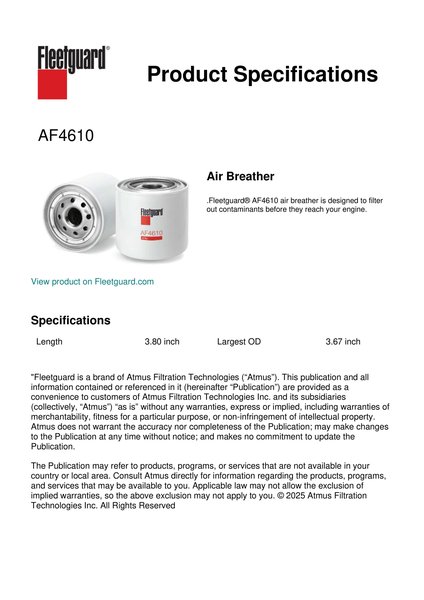 .Fleetguard® AF4610 air breather is designed to filter out contaminants before they reach your engine.Specification